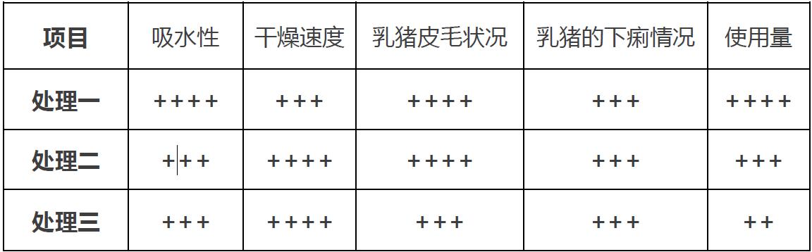 表一:三种干燥剂对初生仔猪干燥等方面的效果